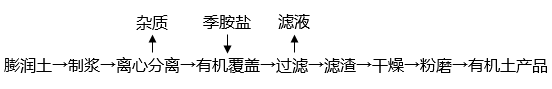 膨潤(rùn)土粉→分散制漿→純化→改性或改性→純化→有機(jī)覆蓋物→過(guò)濾→干燥→粉碎→產(chǎn)品