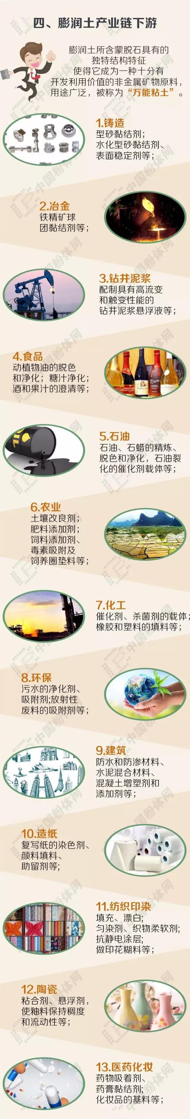 膨潤土是一種開發(fā)應(yīng)用較廣泛、具有較高經(jīng)濟(jì)價值的非金屬礦資源。由于兼具吸附性、離子交換性、遇水膨脹等性能,膨潤土在工農(nóng)業(yè)生產(chǎn)24個領(lǐng)域的100多個部門中均有應(yīng)用,素有“萬能黏土”之稱,與膨潤土有關(guān)的產(chǎn)品多達(dá)100個以上。