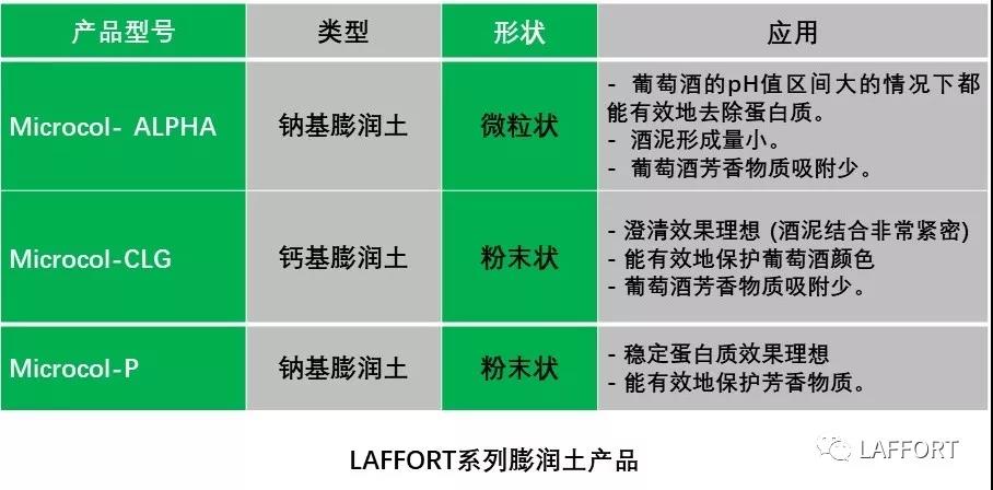 總之,拉氟德公司的三種不同膨潤土產(chǎn)品可以有針對性的使用于不同的處理方案和不同類型的葡萄酒。