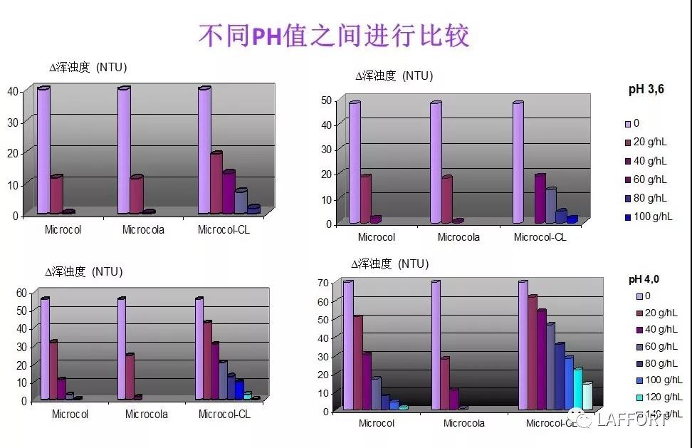 從以上四個圖表中我們可以看出,從pH=3,6開始Microcol ALPHA產(chǎn)品的吸附能力明顯要強于另外兩個產(chǎn)品。Microcol ALPHA產(chǎn)品可以吸附葡萄酒中含電荷數(shù)非常少的蛋白質(zhì)物質(zhì)。