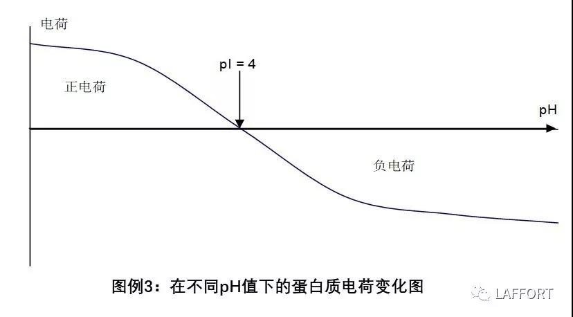 在葡萄酒中會(huì)引起蛋白質(zhì)破敗現(xiàn)象的蛋白質(zhì)都是一些分子量比較小的,介于15 000 和35 000 Da(道爾頓,Dalton)的蛋白質(zhì);該類(lèi)蛋白質(zhì)的等電荷量總是在pl=4到pl=7之間變化。依據(jù)pH的不同,蛋白質(zhì)會(huì)形成特有的負(fù)電荷或者正電荷,而在等電荷的情況下為中性電荷(pl=4)(如圖例3)。