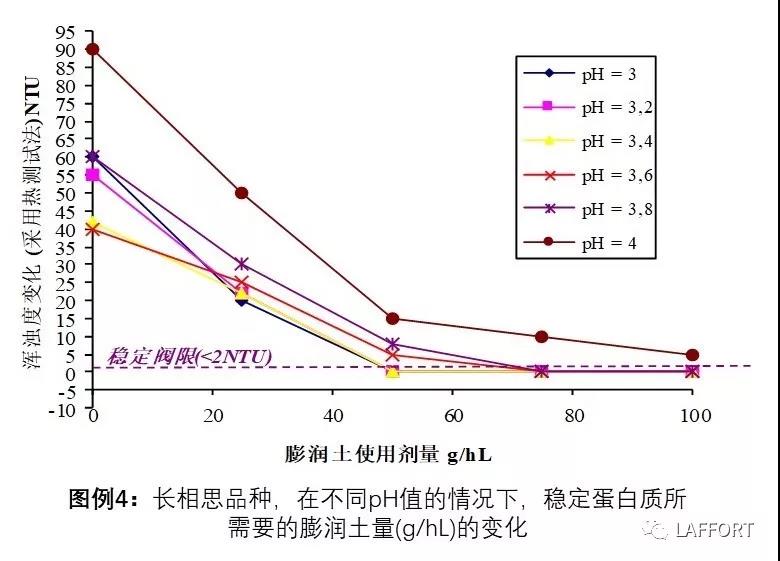 在 pH= 3,4 的時(shí)候,需要使用膨潤(rùn)土50g/hL來(lái)穩(wěn)定蛋白質(zhì);在pH=3,6時(shí),需要使用膨潤(rùn)土75g/hL來(lái)穩(wěn)定蛋白質(zhì);而在pH=4的時(shí)候,我們可以看到使用劑量達(dá)到100g/hL也不能起到穩(wěn)定蛋白質(zhì)的效果。